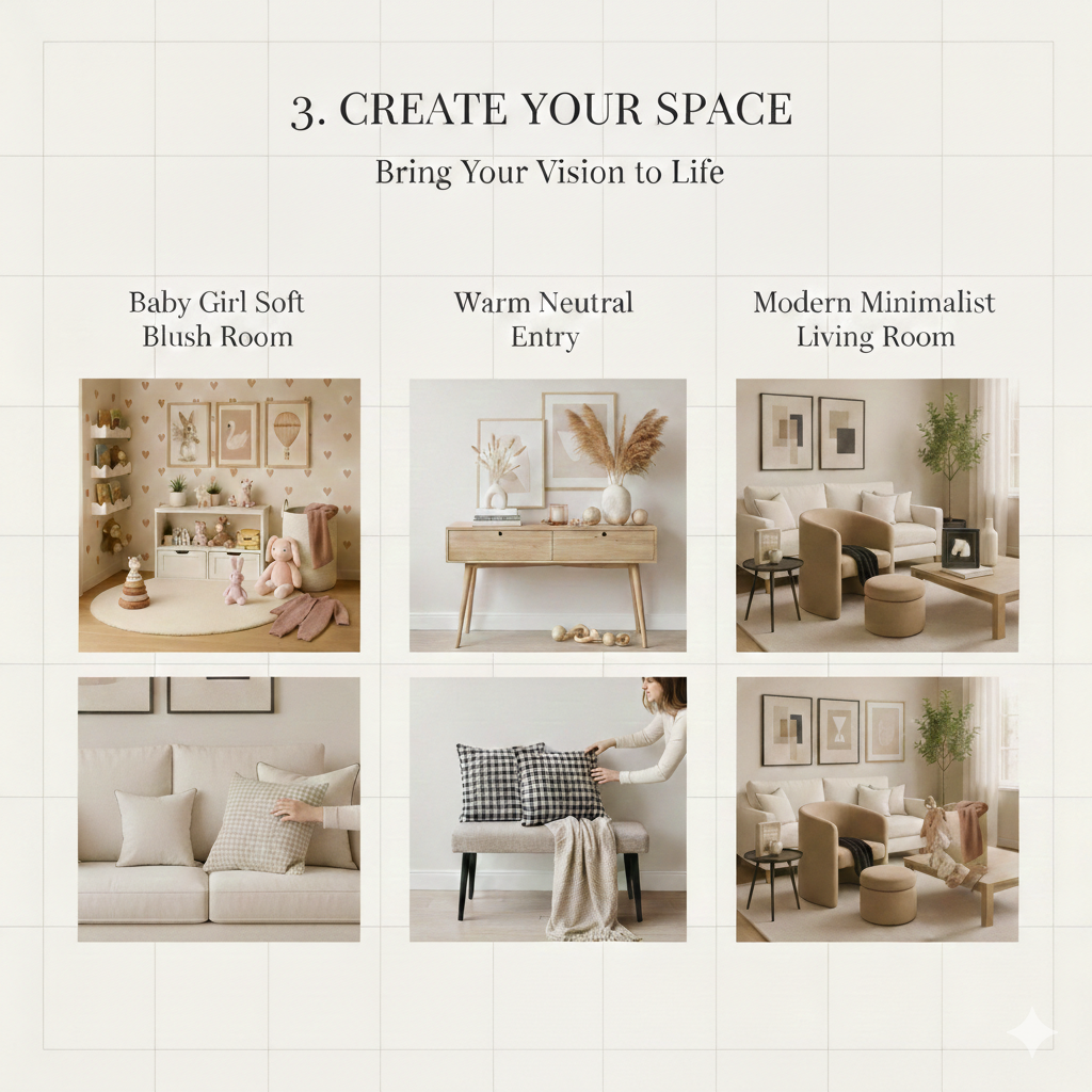 Browse our curated room designs and select the space that fits your style, mood, and needs — from soft blush kids’ rooms to warm neutral entries and modern minimalist living rooms.