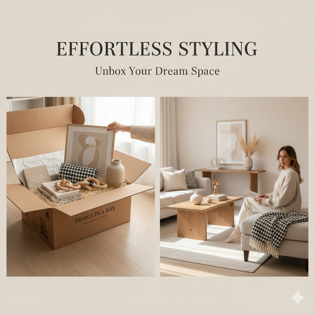 At Design In A Box, we remove the stress and guesswork from interior design. Instead of leaving you to figure out what works together, we curate every item in your room — from furniture and lighting to accessories and textures — so that each piece complements the others perfectly.